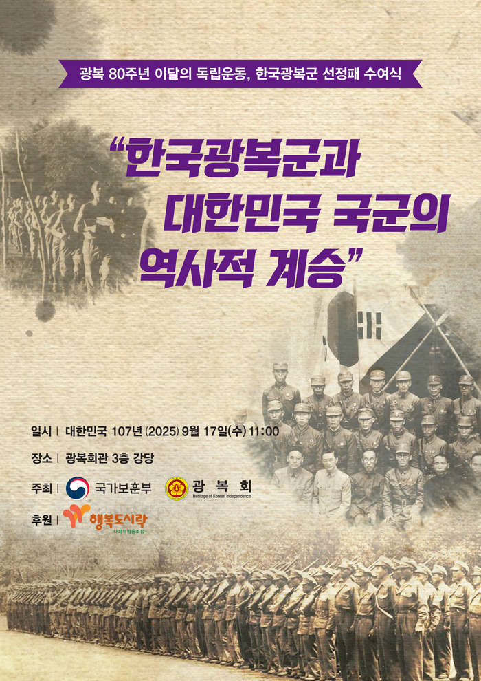 광복회는 오는 9월 17일(수) 오전 11시, 광복회관 3층에서 ‘광복 80주년 이달의 독립운동 – 한국광복군 창설 선정패 수여식’을 개최한다.