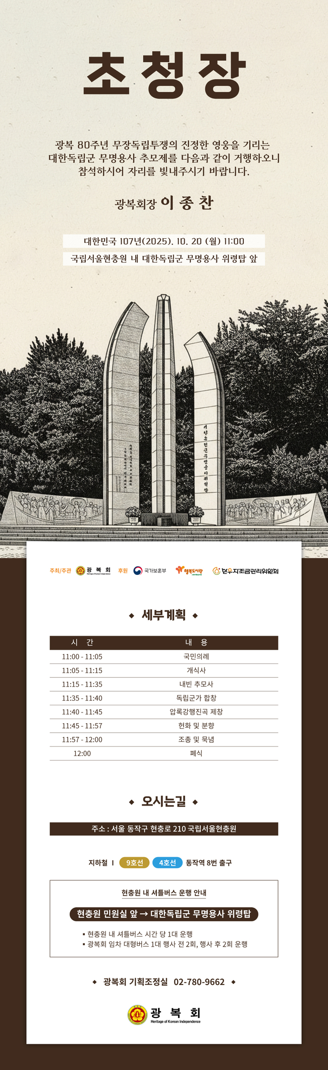 광복회는 오는 10월 20일 오전 11시, 국립서울현충원 대한독립군 무명용사 위령탑 앞에서 ‘대한독립군 무명용사 추모제’를 거행한다. 이번 행사는 광복 80주년을 맞아 일제강점기 이름 없이 싸운 대한독립군 무명용사들의 희생정신을 추모하고, 그 숭고한 뜻을 후손들에게 계승하기 위해 마련됐다. 추모제에는 이종찬 광복회장을 비롯해 국가보훈부 장관, 공법단체 및 유관단체 대표, 대한독립군 기념사업회 관계자, 광복회원 등 250여 명이 참석할 예정이다.