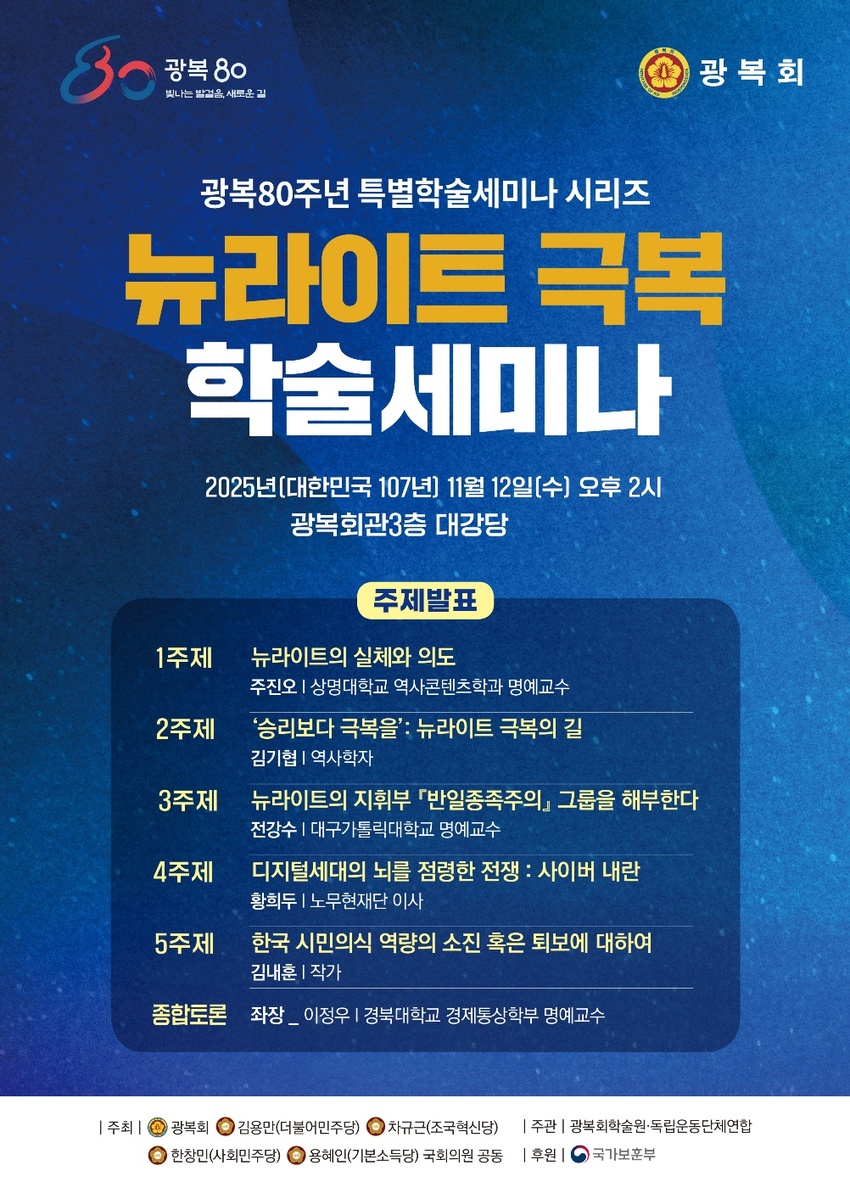 광복회는 광복 80주년을 맞아 왜곡된 역사관을 바로잡고 올바른 역사 인식 확립을 모색하는 ‘뉴라이트 극복 학술세미나’ 를 연다. 세미나는 11월 12일(수) 오후 2시, 광복회관 3층 대강당에서 열린다.