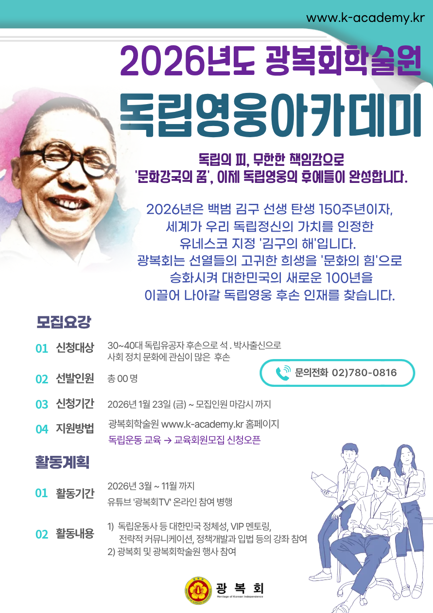 광복회는 선열들의 고귀한 희생을 ‘문화의 힘’으로 승화시켜 대한민국의 새로운 100년을 이끌어나갈 중견 후손 인재를 모십니다.